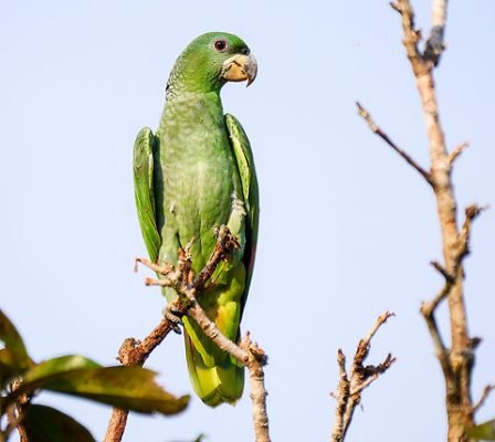 Kawall’s Amazons have predominantly green feathers with touches of yellow on the crown and red markings on the wings. They are medium-sized, measuring about 33–36 cm (13–14 inches) in length. Their charming personality includes playful behavior, strong social bonds, and the ability to mimic sounds, though they are generally quieter than other Amazon species.